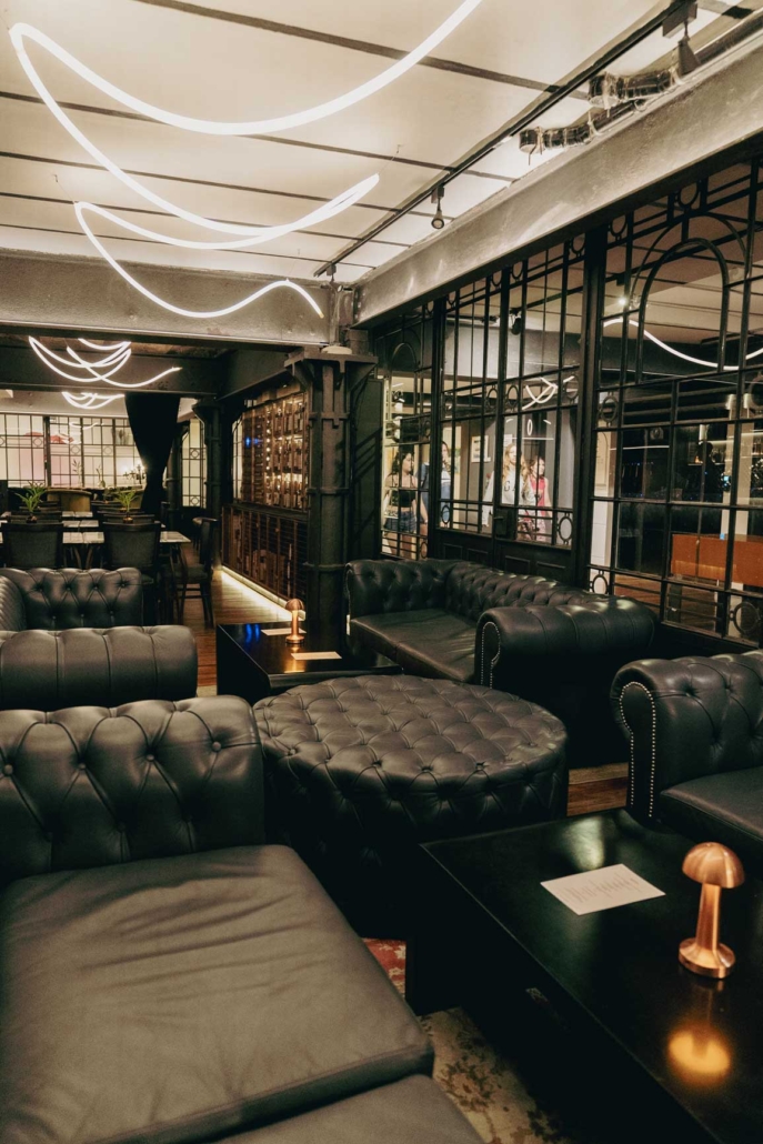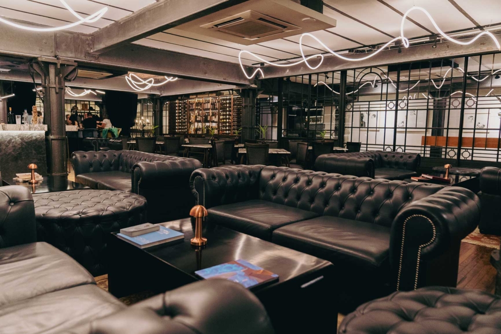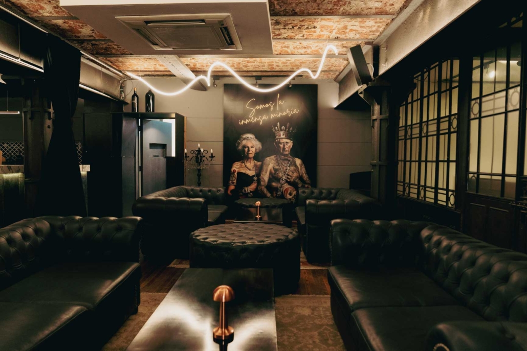 Un rincón acogedor con sillones de cuero Chesterfield, perfectos para largas conversaciones. Las mesas bajas negras y alfombras suaves completan el espacio, creando una atmósfera íntima y relajante.